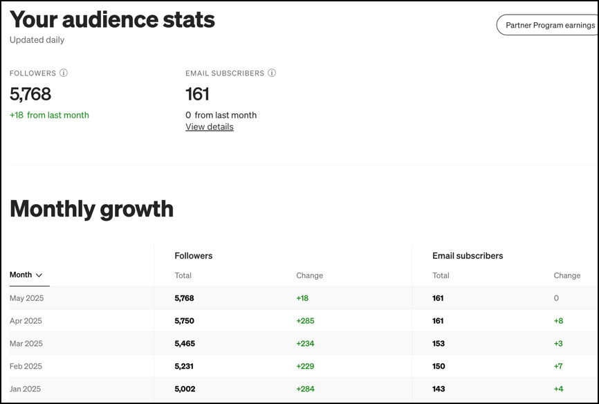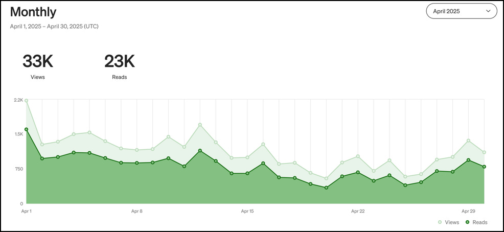I use ChatGPT to help me organize my thoughts, and it’s been telling me to focus on what’s working – Medium. And that’s what I plan on doing in May.