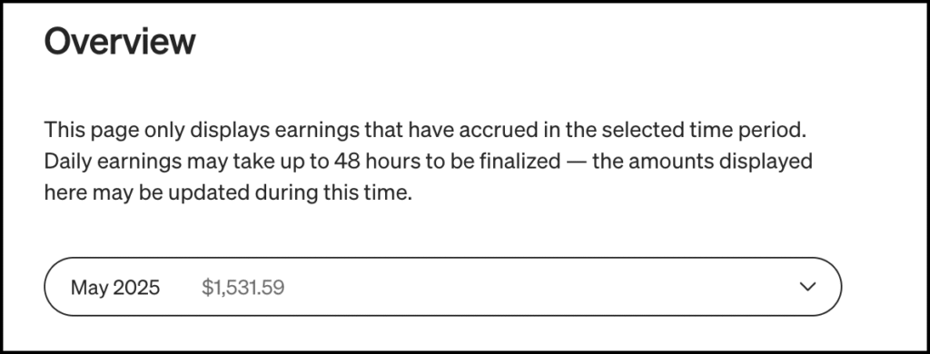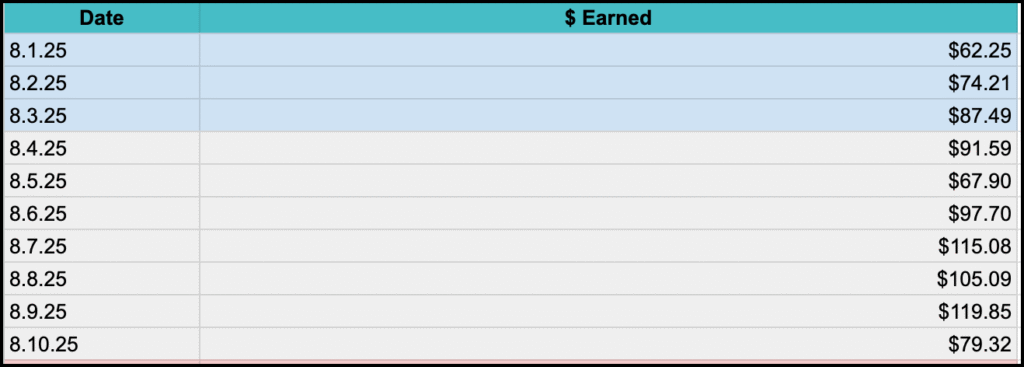 Here’s a peak at what my daily earnings looked like at the beginning of the month: