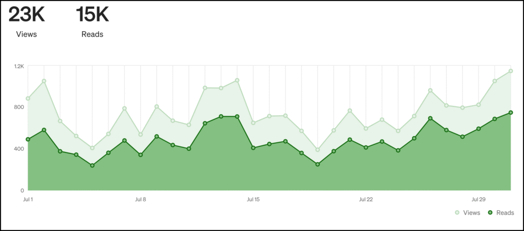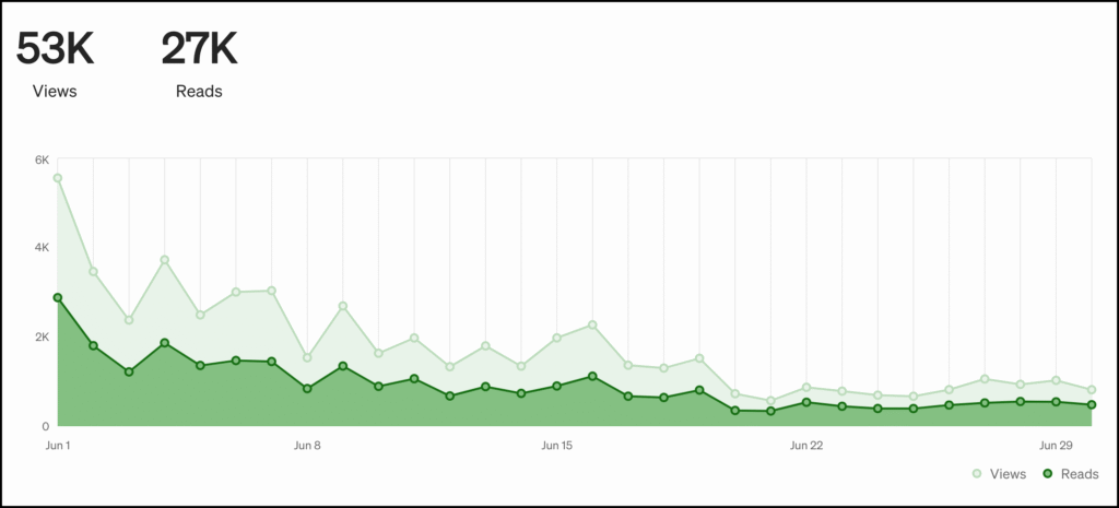 Milestone #1 was having the most reads and views ever in a month. My best month before this was June:
