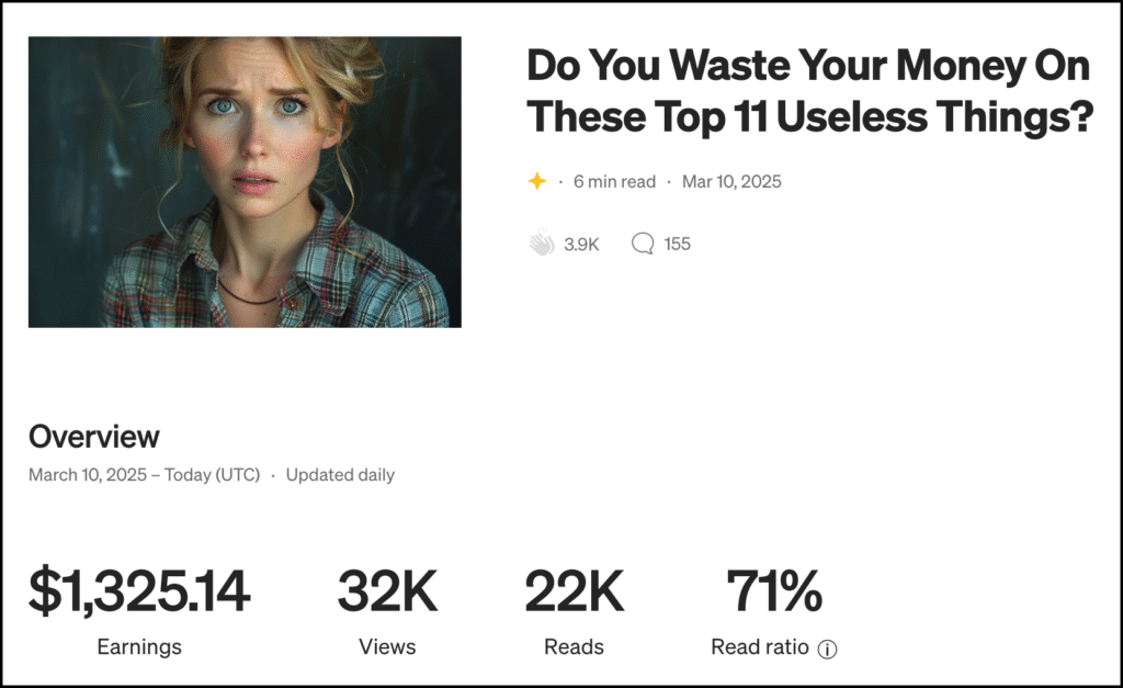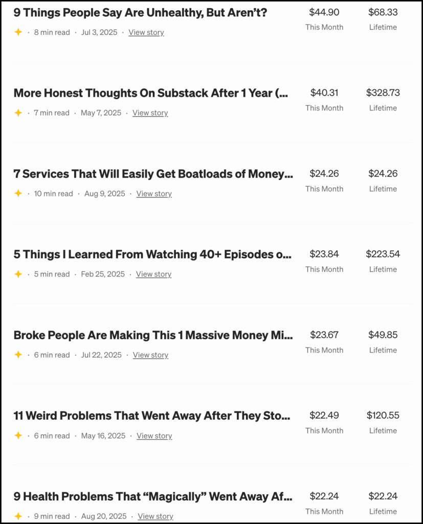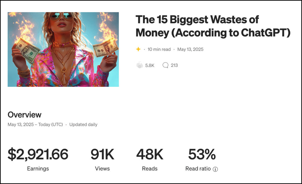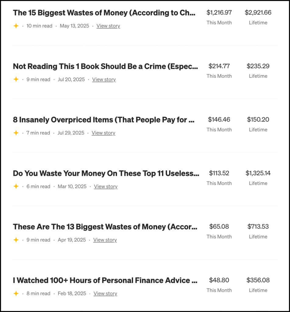 The top article, The 15 Biggest Wastes of Money (According to ChatGPT), has been carrying me for months! It had a huge resurgence this month for some reason and earned another $1,200! It’s close to becoming my first $3,000 article.
