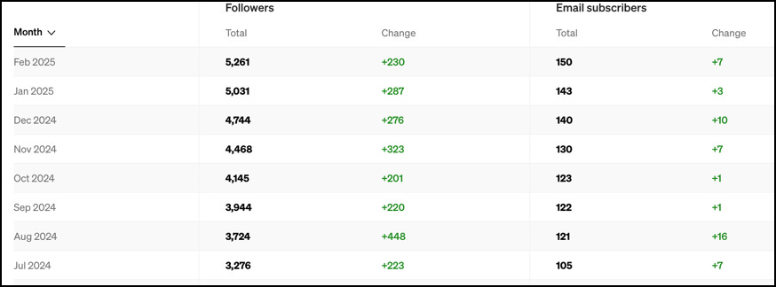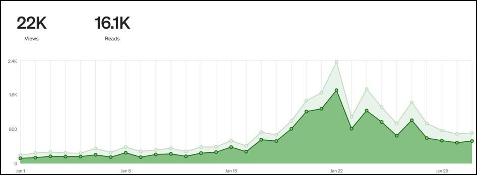 January was my best month ever for reads & views due to that viral article. Here’s February:
