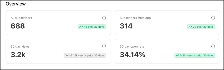 I don’t have a paid newsletter, so I’ll just focus on the subscribers I picked up. Last month, I was at 640 subs. Here’s what it looks like now: