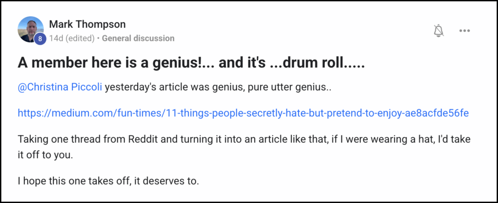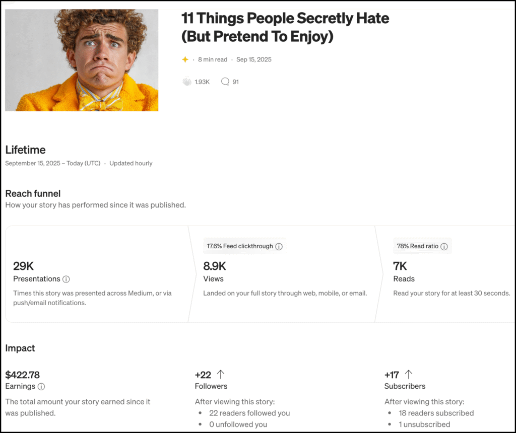 11 Things People Secretly Hate (But Pretend to Enjoy) beat out my “Wastes of Money” ChatGPT article, which has been earning like crazy the past few months. In his Inner Circle community, Mark Thompson called this one genius as soon as I wrote it.