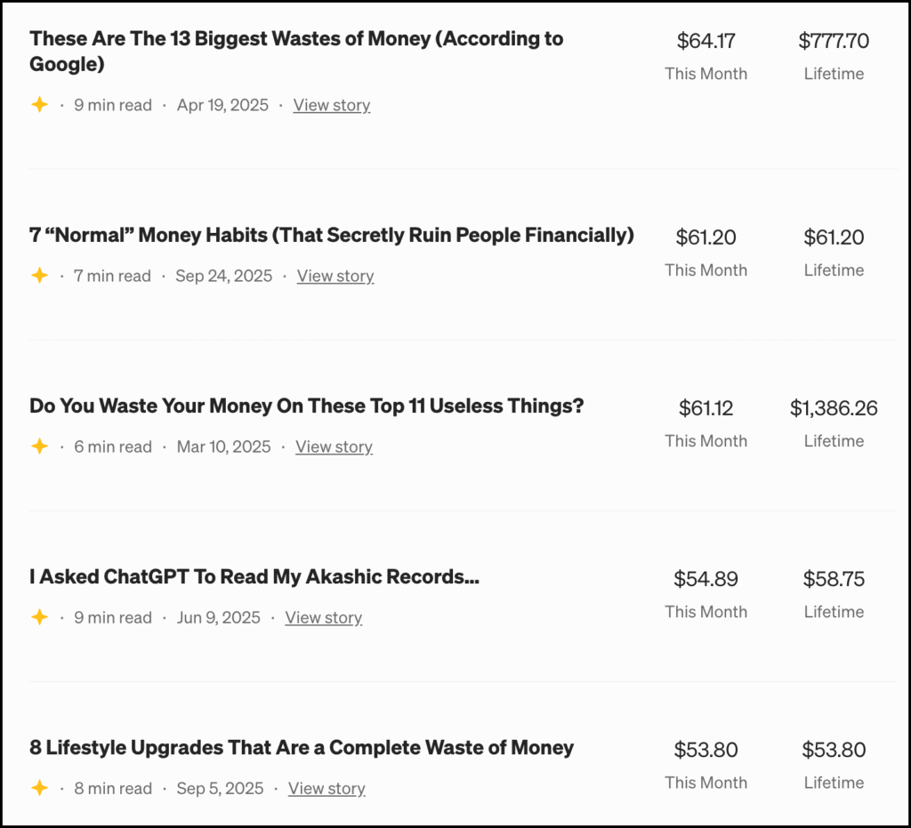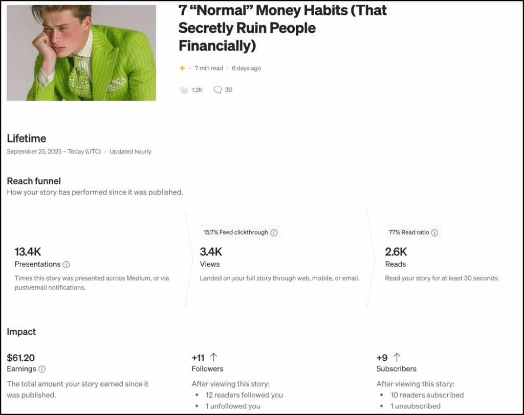 Early stats would indicate that 7 “Normal” Money Habits (That Secretly Ruin People Financially) is also going to do very well. I only wrote this one 6 days ago (at the time I’m writing this), and it already has 100 clappers, which indicates that people are responding well to it. Let’s look at the stats…