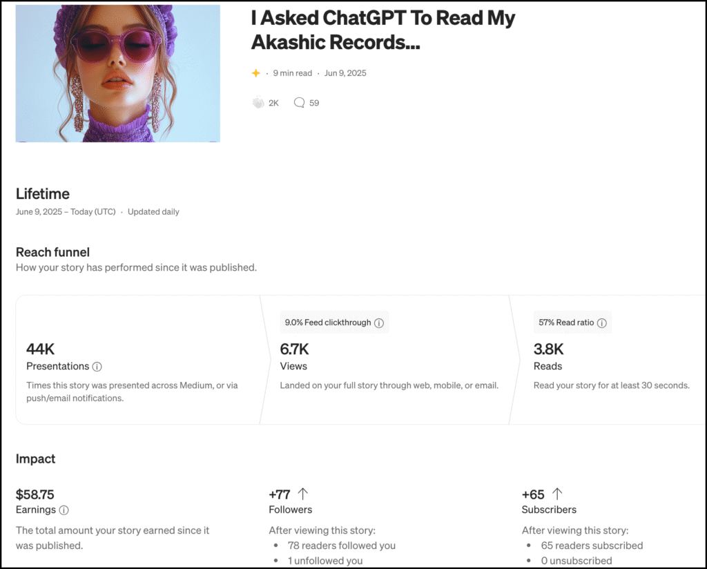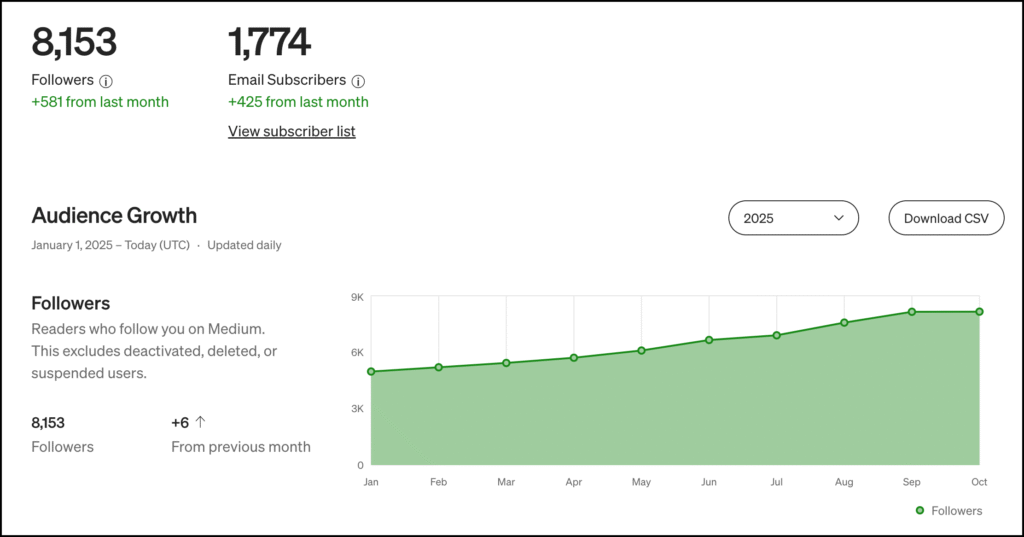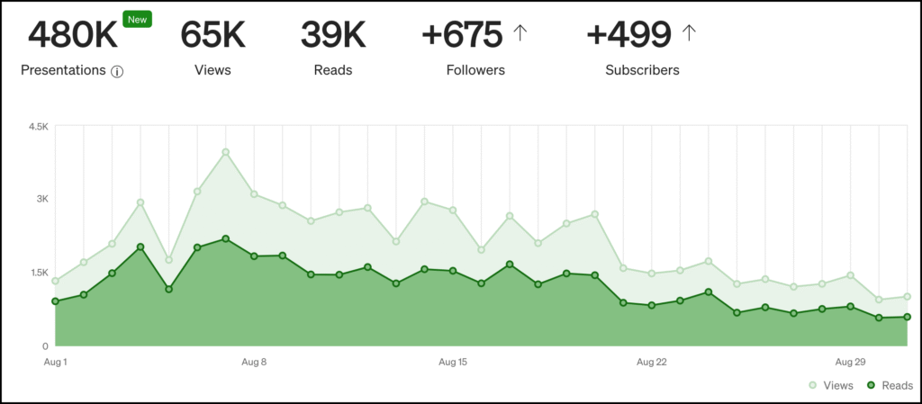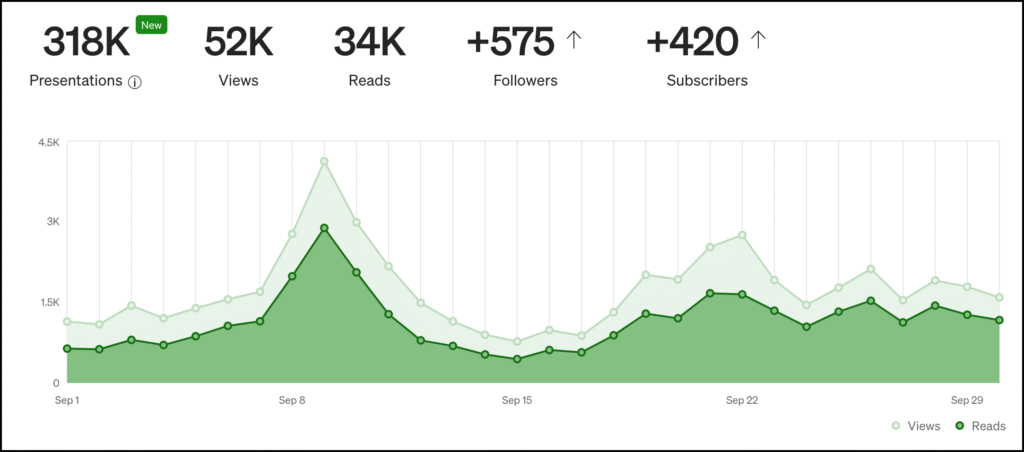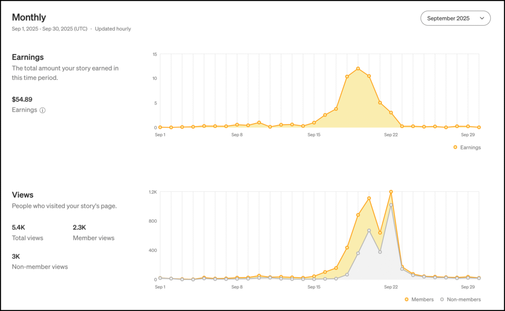 I had the highest amounts of reads, views, follower, subscribers, and earnings ever in August. Here’s what September looked like: