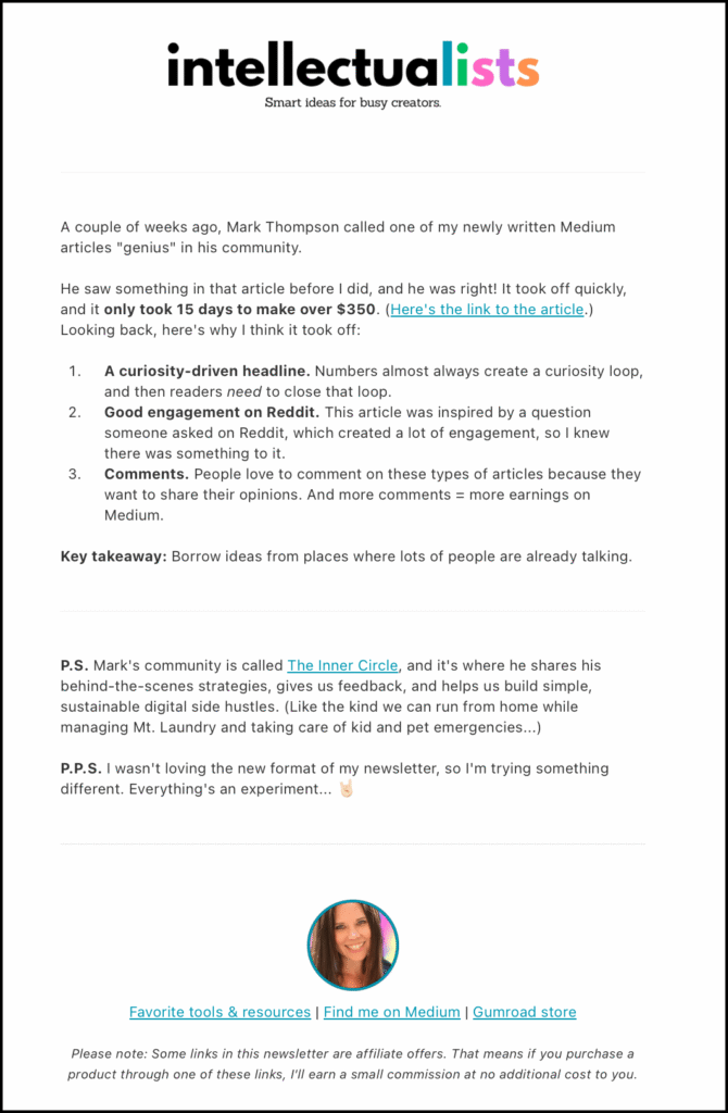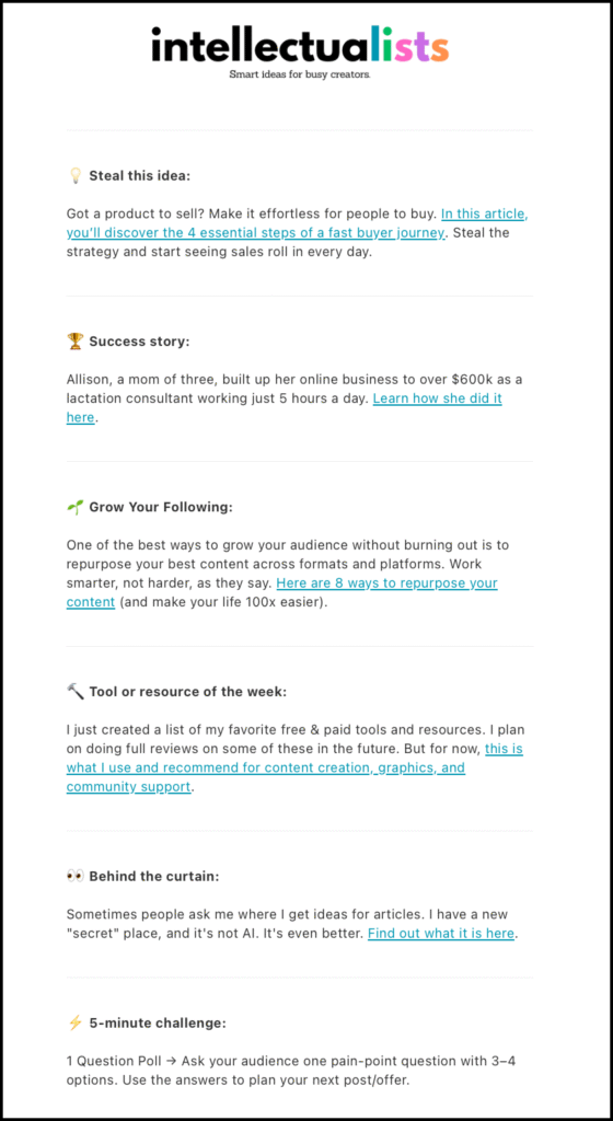 As mentioned, I recently restarted my Intellectualists newsletter, and I already changed it. I started with 5 links to curated resources, plus a quick challenge. But, I wasn’t feeling it. Here’s what it looked like when I relaunched it, and what it looks like now, just a couple weeks later.